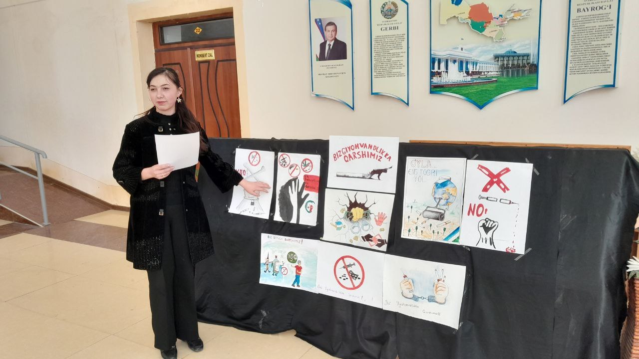 ""Biz giyohvandlik va psixotrop moddalarga qarshimiz" va "Sog‘lom turmush tarzi tarafdorimiz" shiori ostida yoshlar o‘rtasida madaniy~ma'rifiy tadbirlar va rasmlar tanlovini o‘tkazish yuzasidan chora ~tadbirlar rejasi"da belgilangan vazifalar ijrosini ta'minlash maqsadida, rasmlar ko‘rgazmasi tadbiri bo'lib o'tdi. Tadbirda giyohvandlik va psixotrop moddalarning zararlari to‘g‘risida o‘quvchilarga tushuntirish ishlari olib borildi.